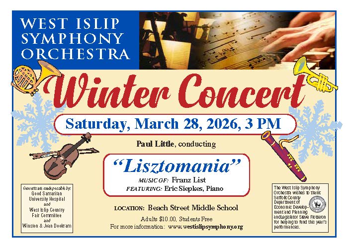 The West Islip Symphony Orchestra returns this March for their annual Winter Concert, "Lisztomania" — a celebration of the bold and electrifying music of Franz Liszt. Under the baton of conductor Paul Little, the orchestra will be joined by featured pianist Eric Siepkes for an afternoon of breathtaking classical performance. The concert takes place Saturday, March 28, 2026 at 3 PM at Beach Street Middle School. Admission is $10 for adults and free for students. For more information, visit westislipsymphony.org.