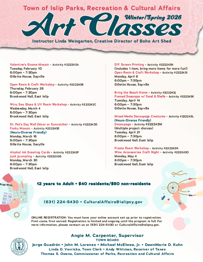 Unleash your creativity this Winter/Spring with art classes for all skill levels, led by instructor Linda Weingarten of Boho Art Shed! Register today for just $40 (residents) — call (631) 224-5430 or visit