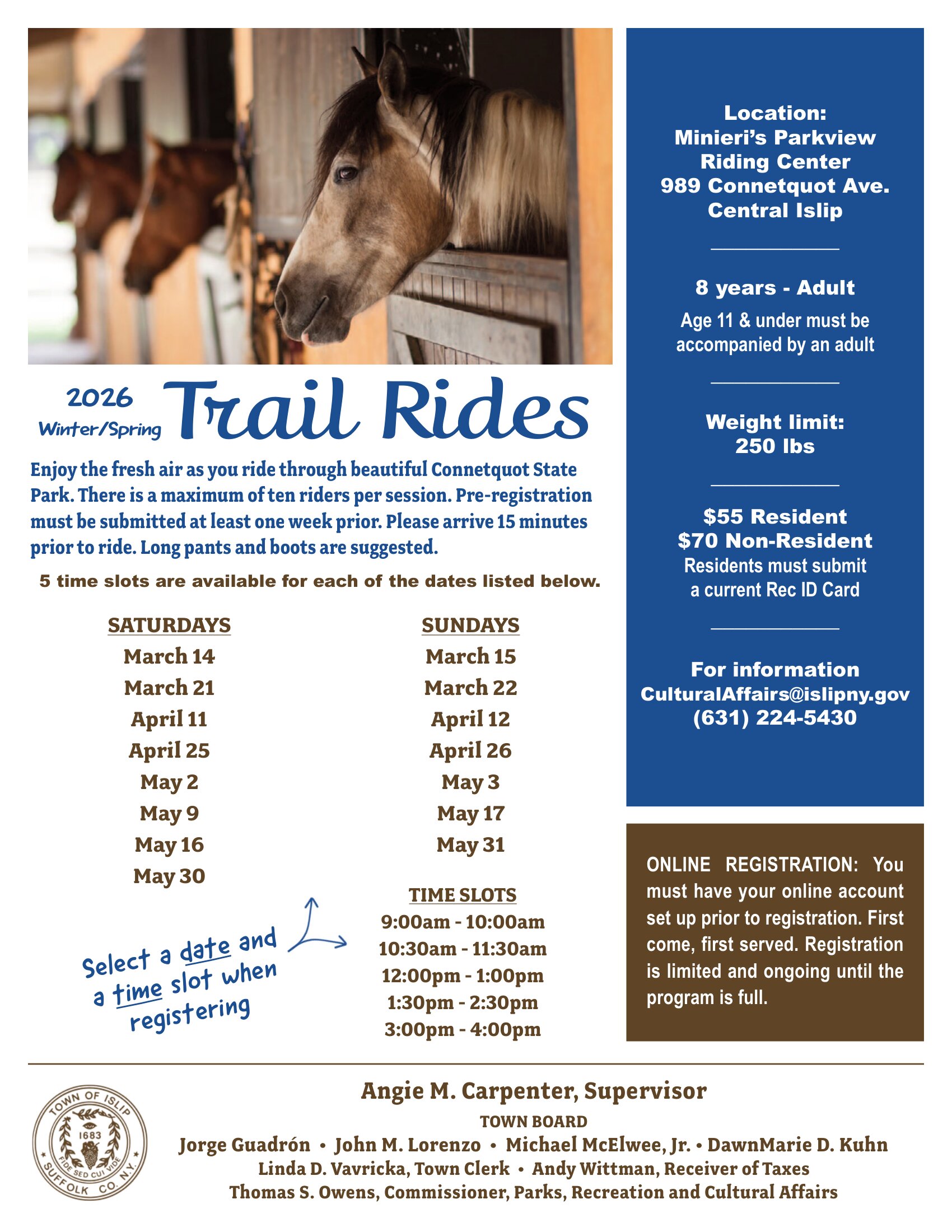 Saddle up for an unforgettable ride through Connetquot State Park this winter/spring! The Town of Islip is offering guided trail rides for ages 8 and up — register early, as spots fill fast at just 10 riders per session.
