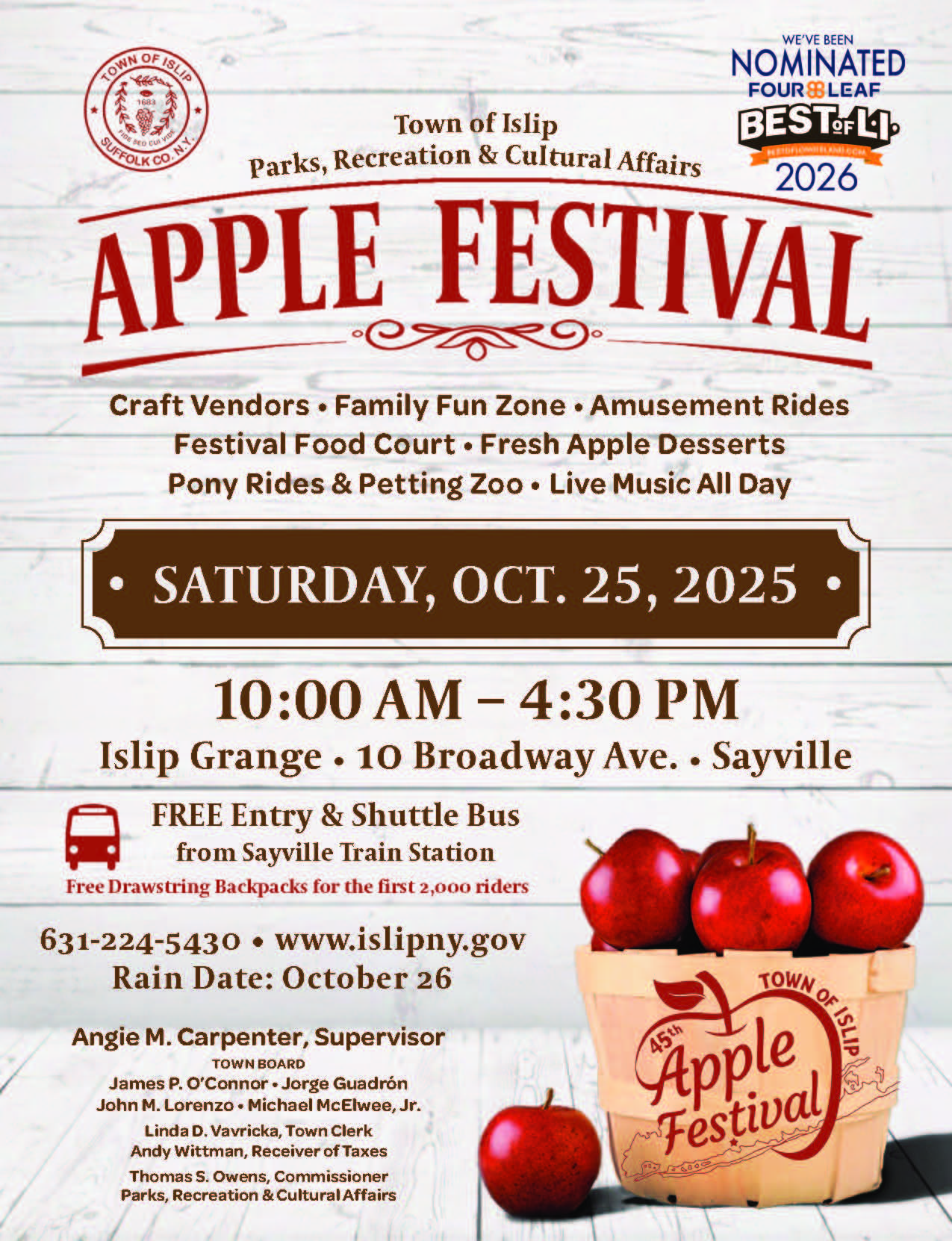 – Islip, NY – The Town of Islip’s beloved Apple Festival has been nominated for Best Annual Event in the Best of Long Island 2026 competition.Residents can show their support and help showcase the Town’s wonderful community spirit by voting once per day at: