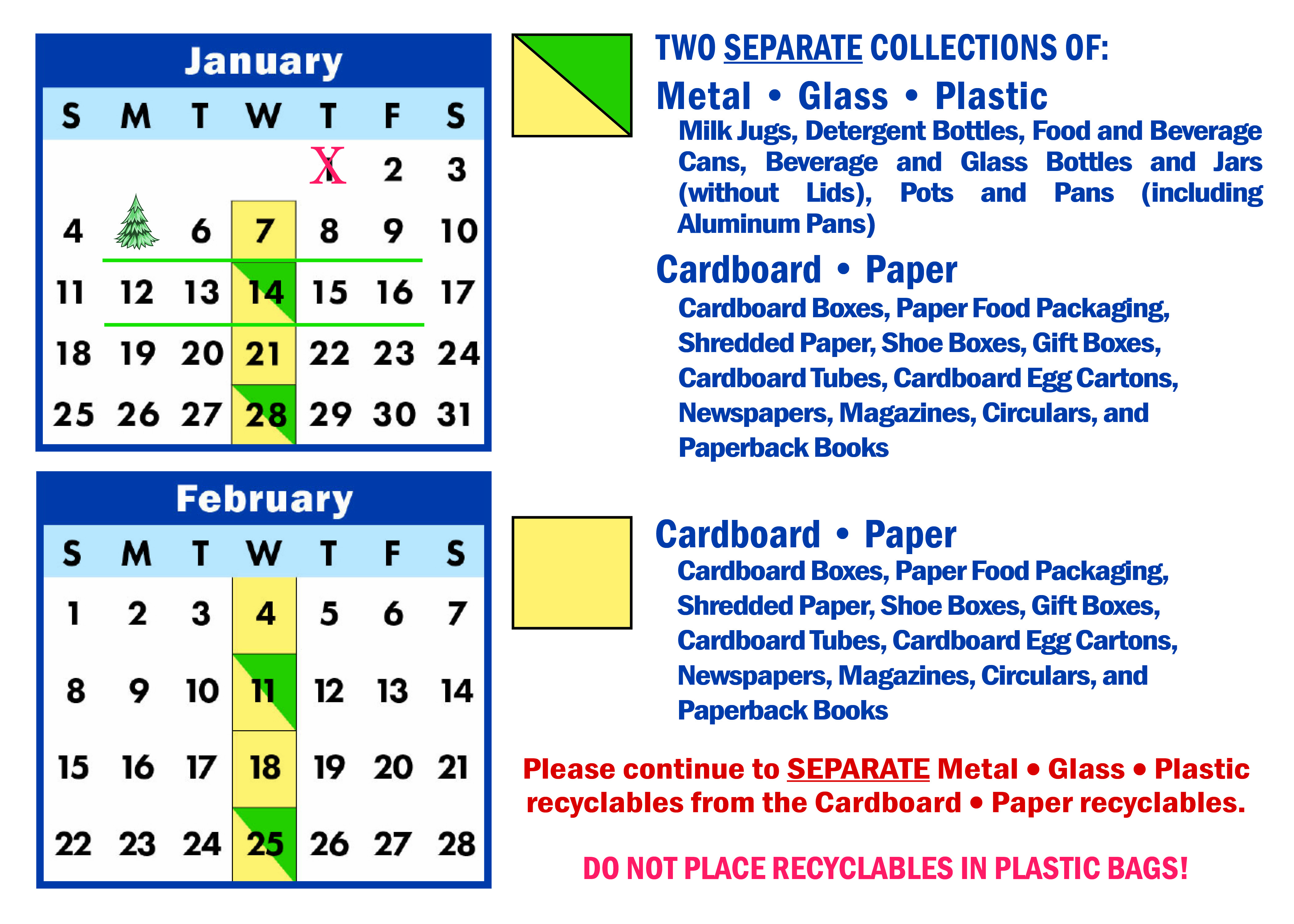 Cardboard & Paper will be collected every Wednesday. On the alternating weeks that metal, glass & plastic is also collected, a second truck will come to collect separated cardboard and paper.