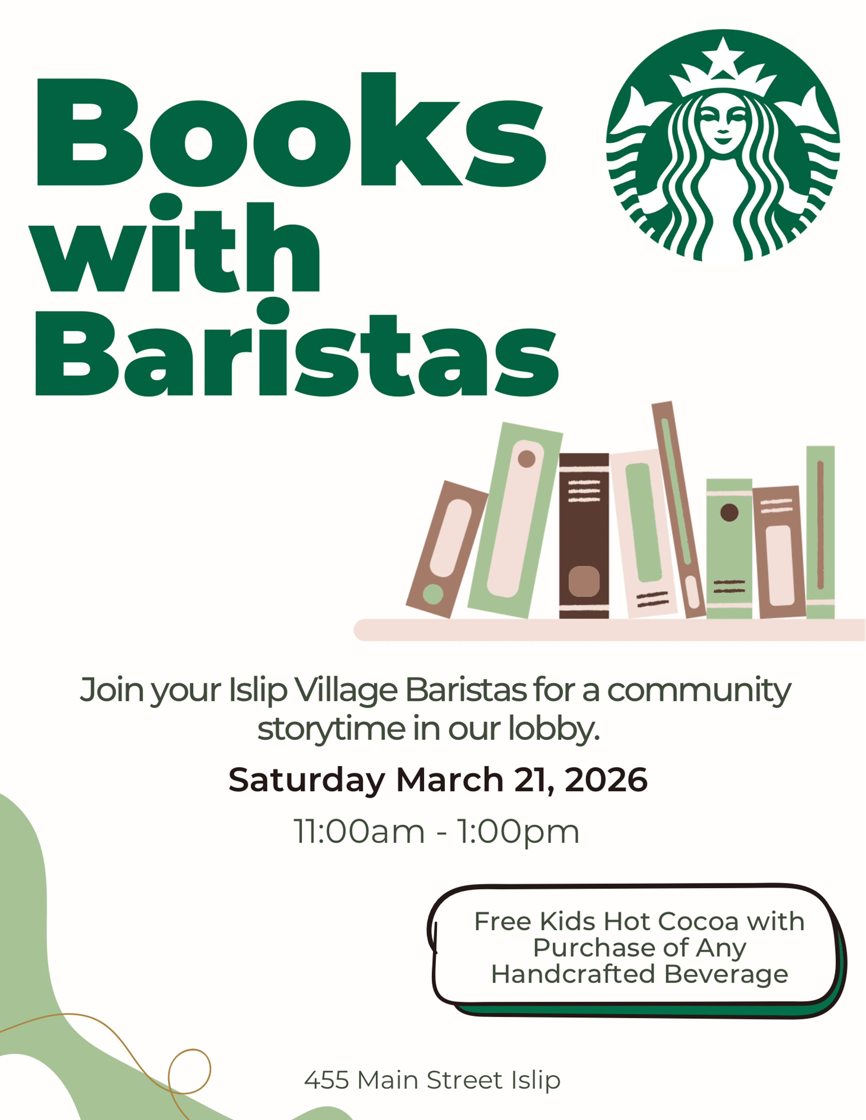 The Islip Village Starbucks is hosting a fun and cozy community storytime event — Books with Baristas! Join your local baristas in the lobby on Saturday, March 21, 2026 from 11:00am to 1:00pm for an afternoon of stories and good company. As a special treat, kids receive a free Hot Cocoa with the purchase of any handcrafted beverage. Stop by and make a morning of it at 455 Main Street, Islip.