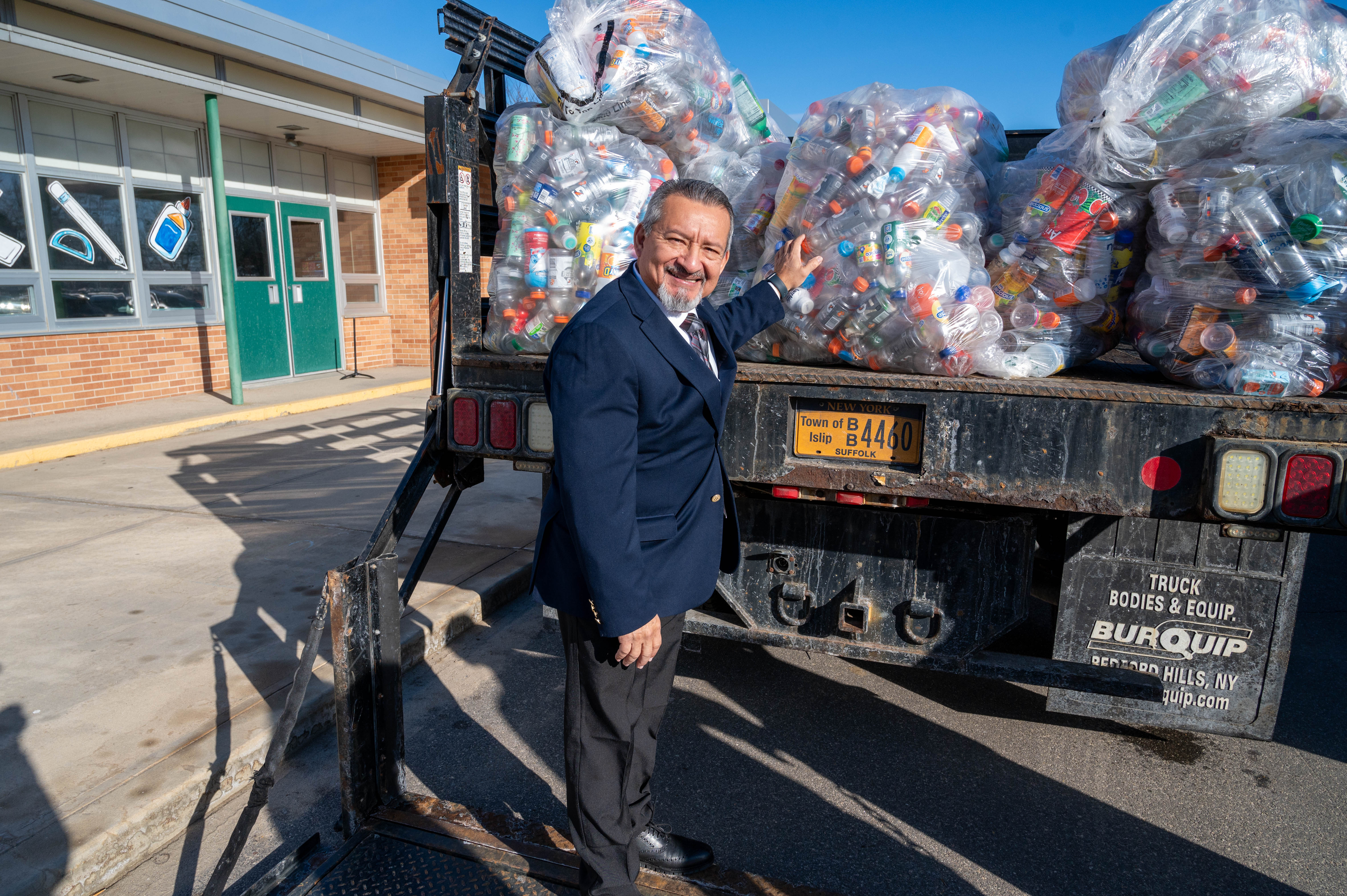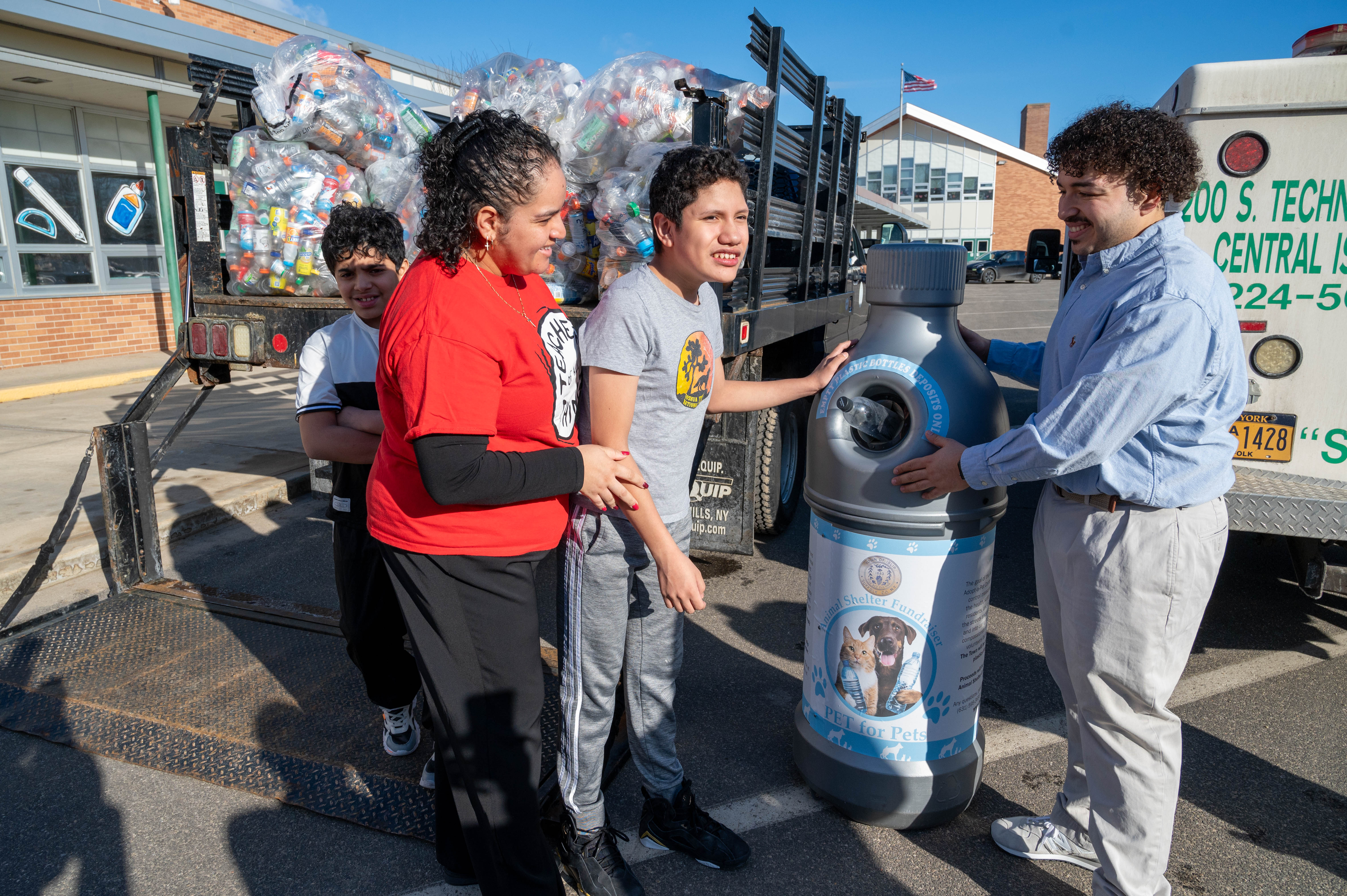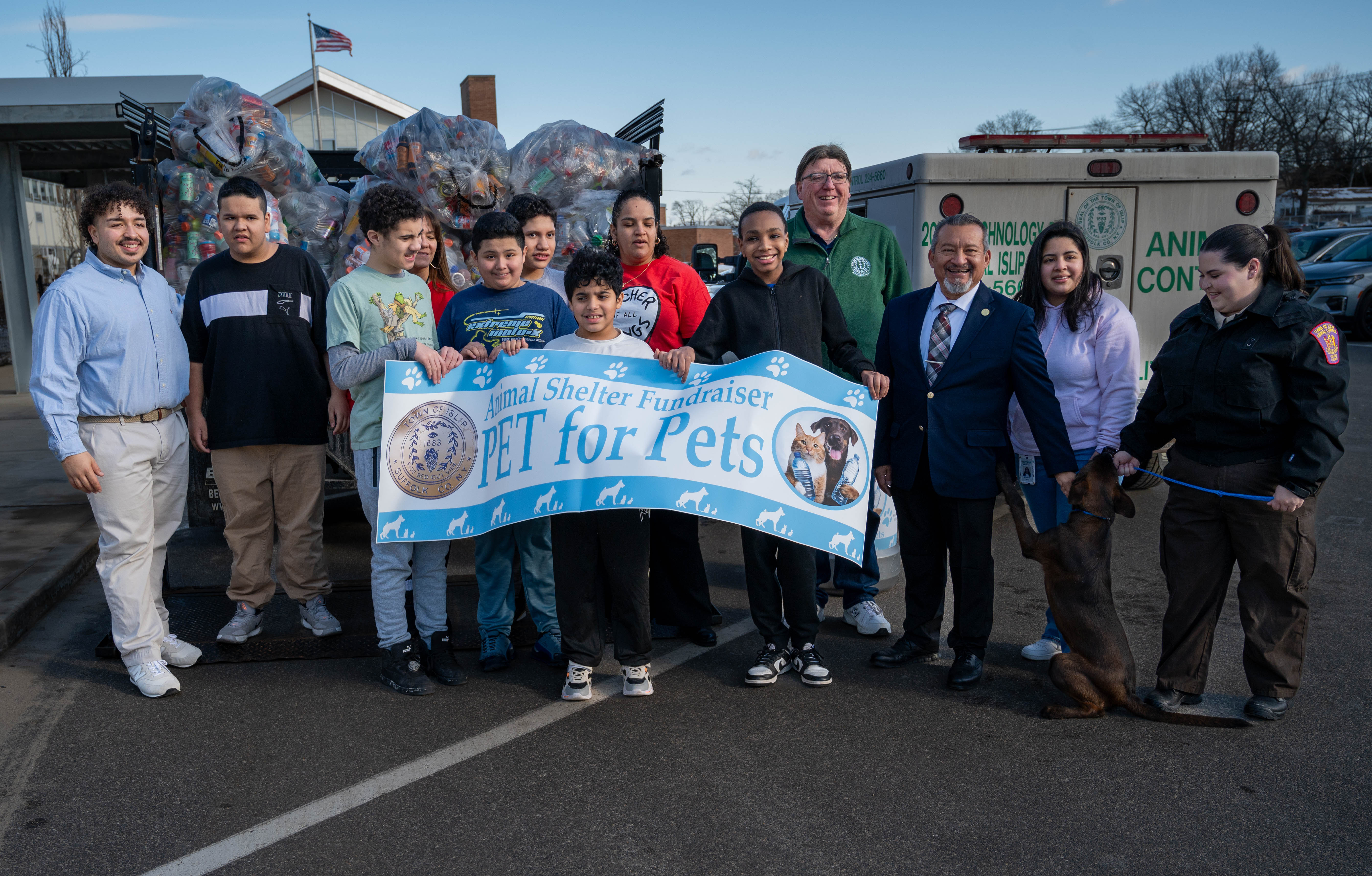 Students from Brentwood’s West Middle School gathered with faculty, staff, and Islip Town officials, including Councilman Jorge Guadron to donate 2,000 plastic bottles collected over the course of the schoolyear to the Town’s PET for Pets initiative. Students in Mrs. Tronolone and Mrs. Patton’s middle school class oversaw the collection. The students’ recycling effort is part of Mr. Rivera’s Green Machines Recycling project designed to reduce the school’s carbon footprint, give back to the community and to students.These bottles were brought to the bottle redemption center courtesy of the Town of Islip DEC. Proceeds from the deposit fee were donated to the Town of Islip Animal Shelter. A total of $100 is now able to be put to use towards purchasing much needed equipment for the shelter such as walkie talkies, a new computer that monitors exercise for animals, leashes, blankets and more.